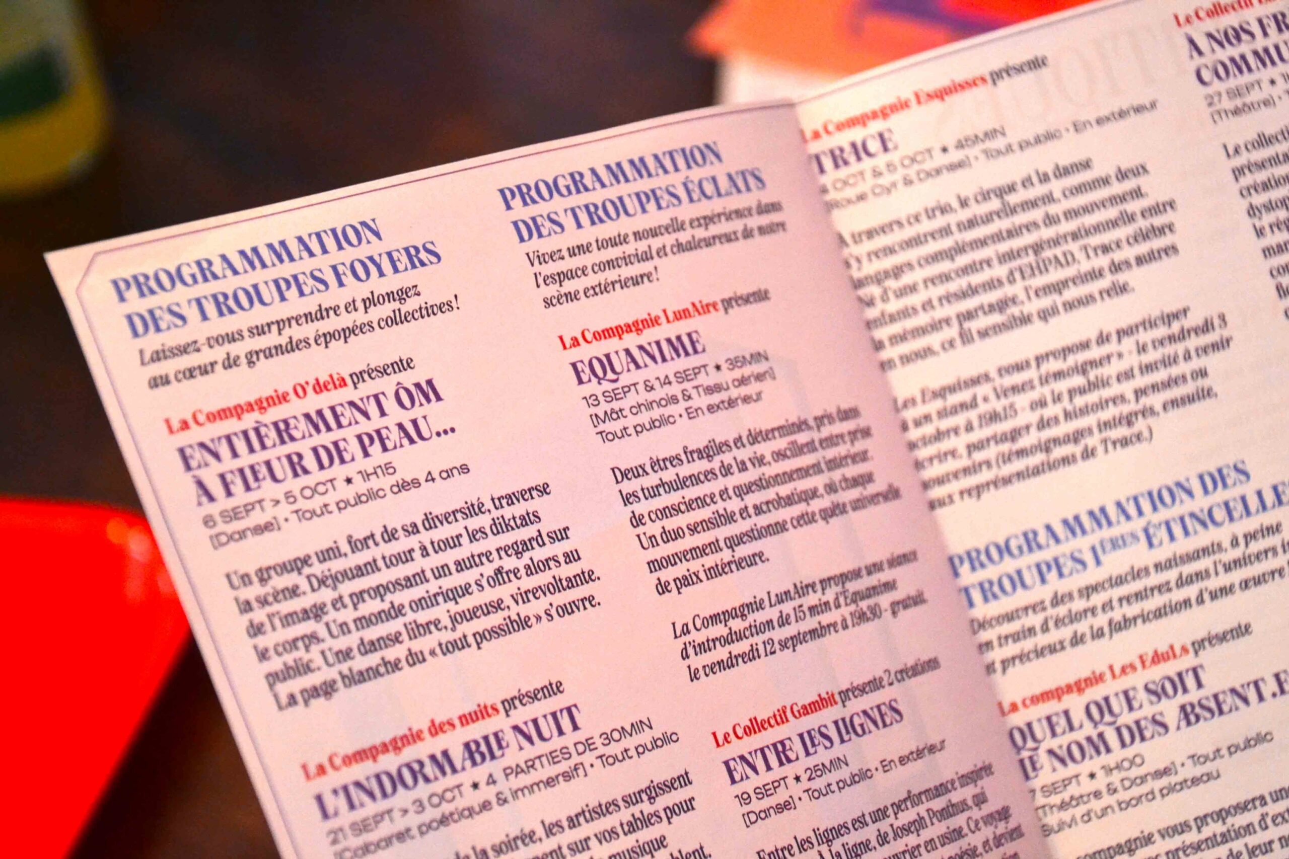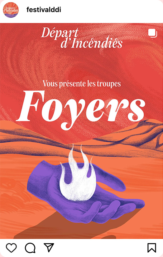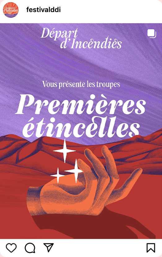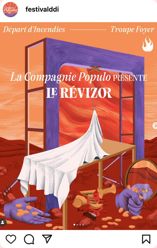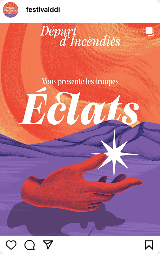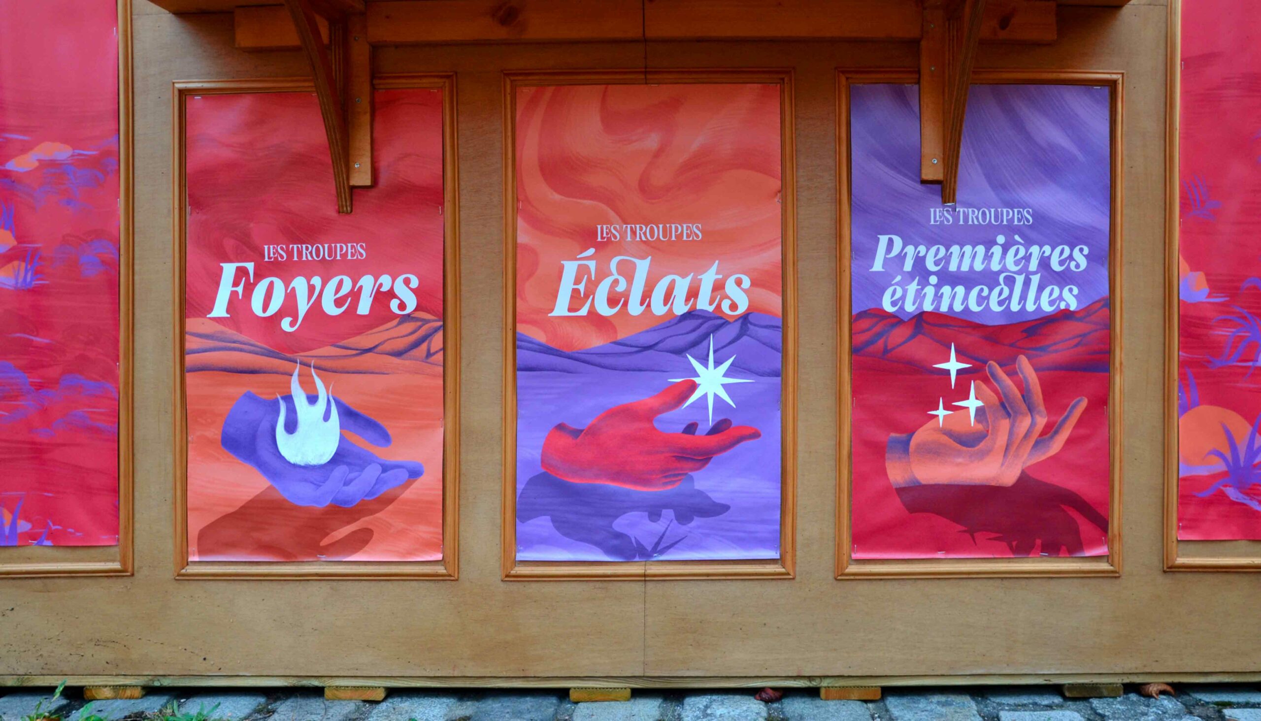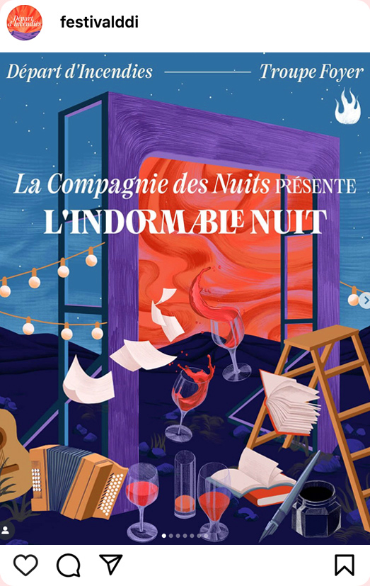 Direction artistique, illustration et déclinaison des supports de communication : affiche de festival, affiches de troupes, brochure, réseaux sociaux, scénographie