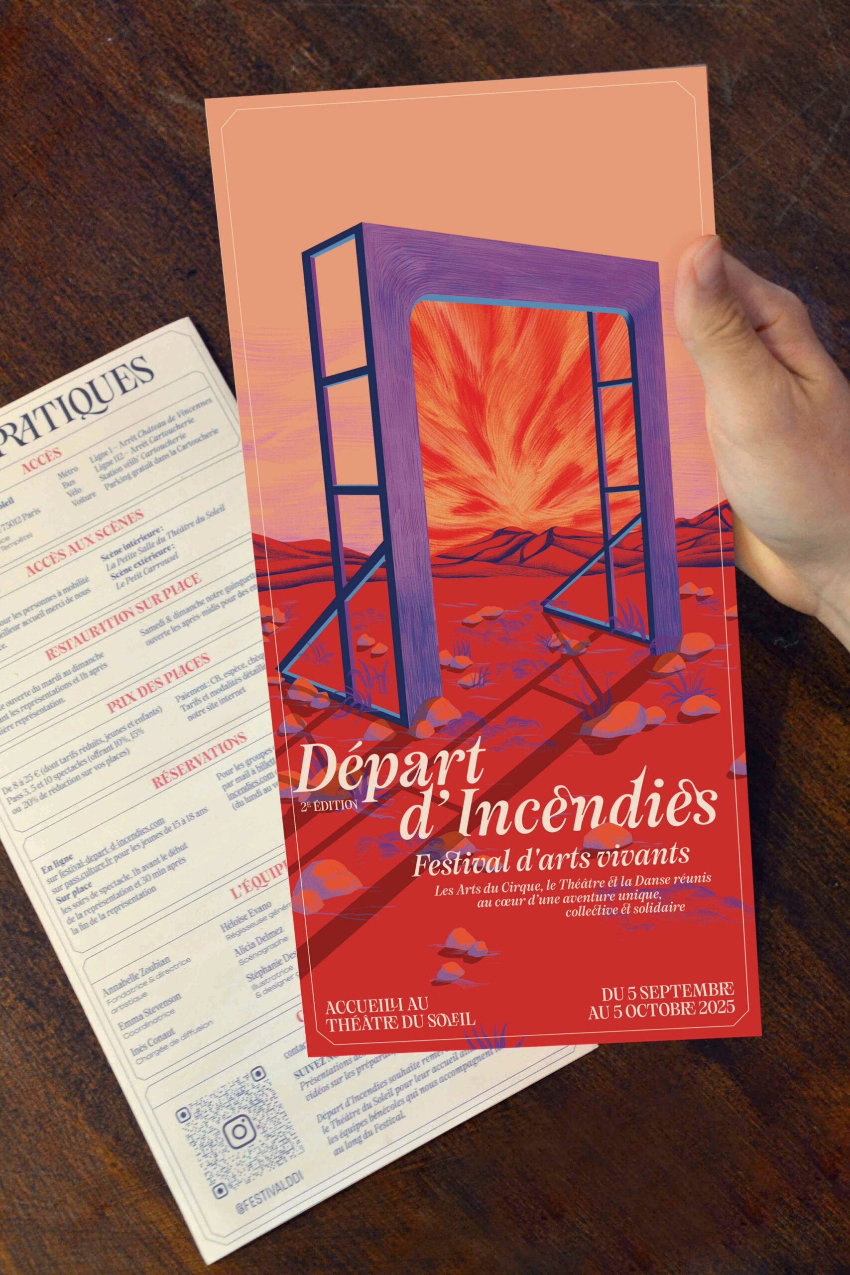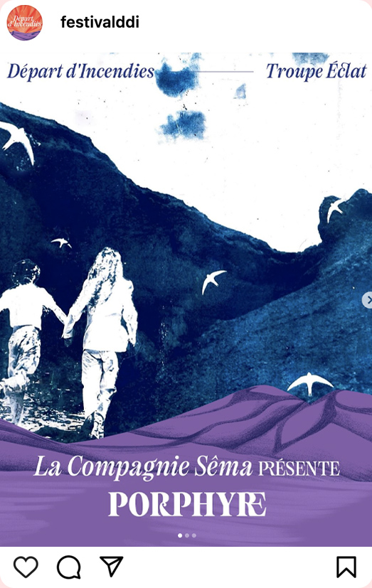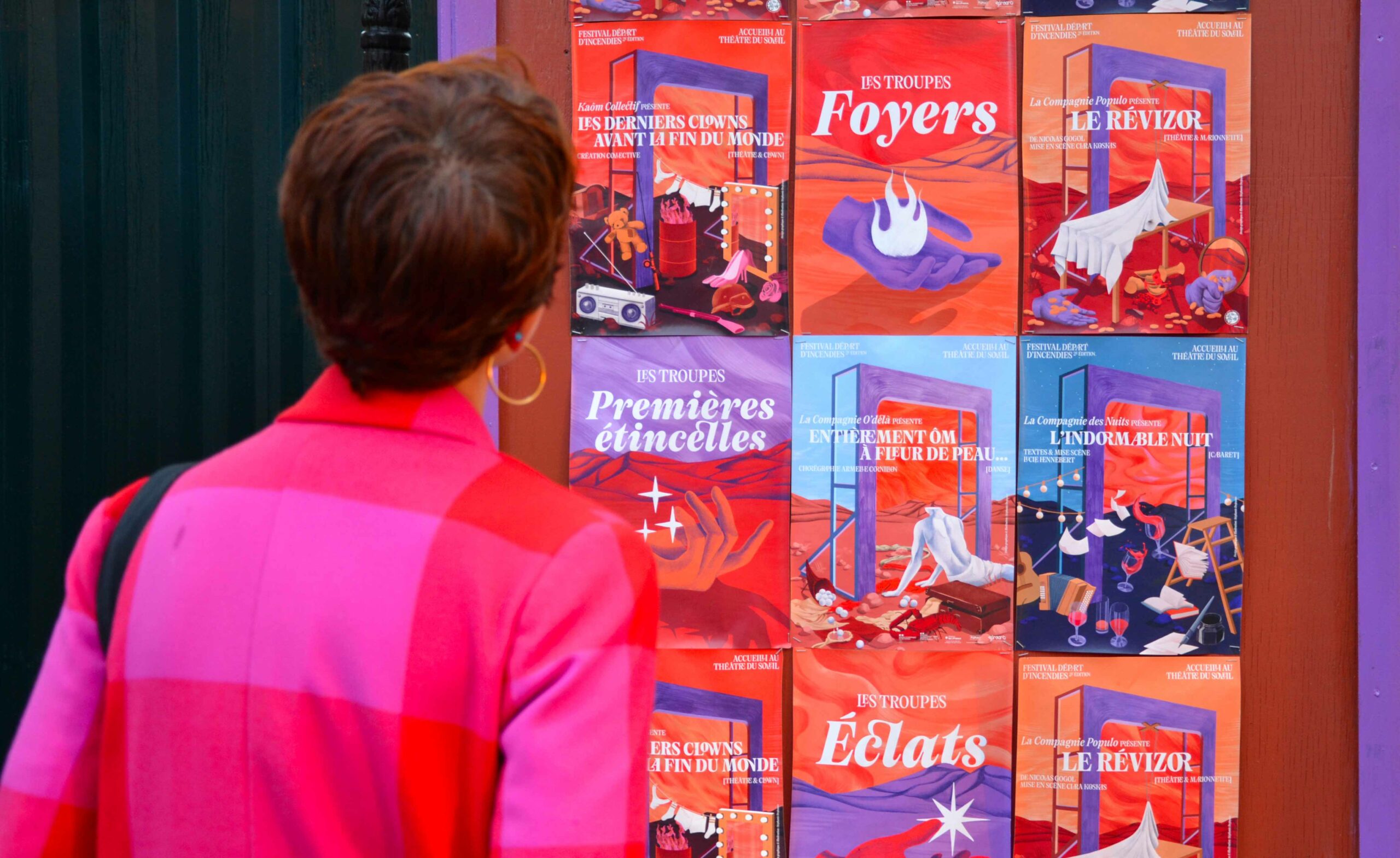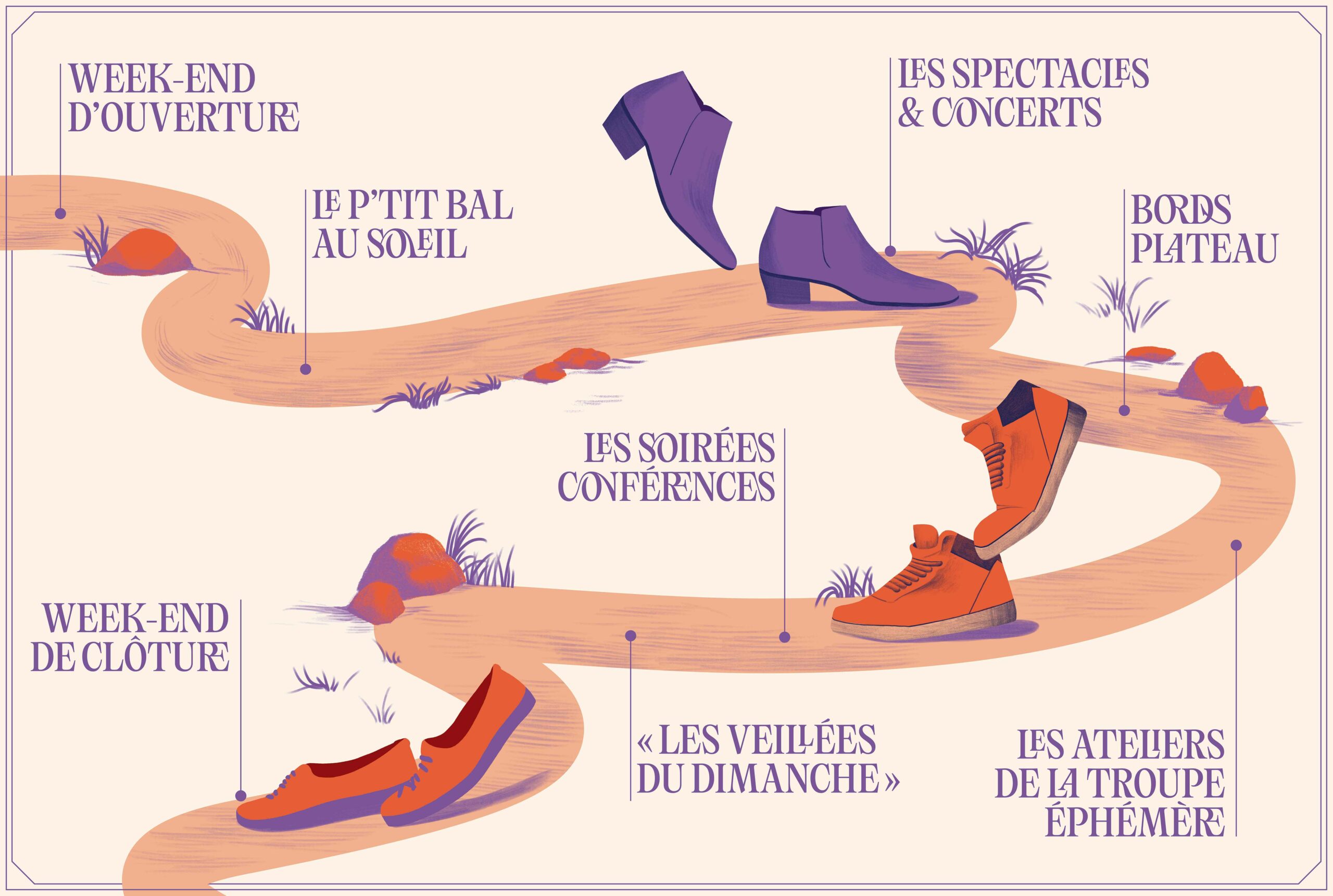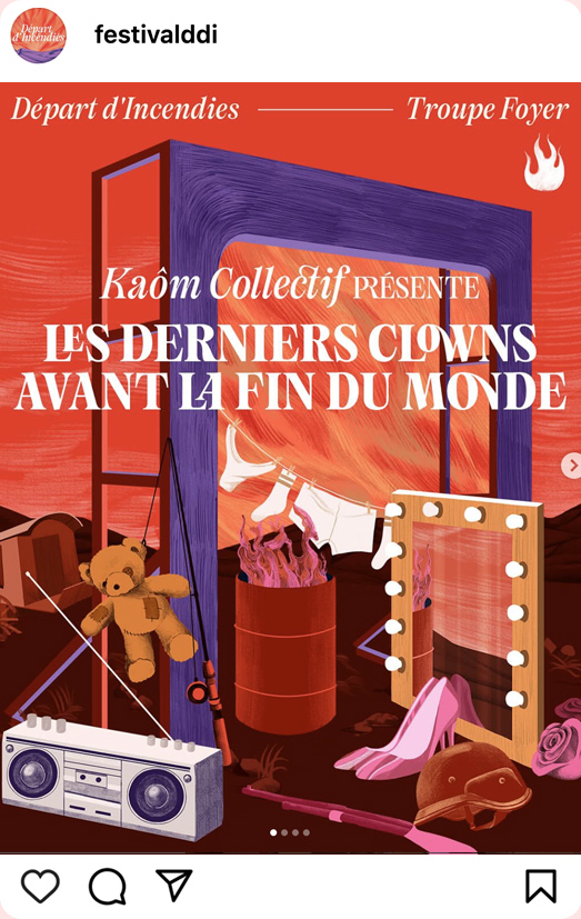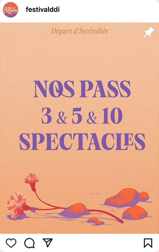Direction artistique, illustration et déclinaison des supports de communication : affiche de festival, affiches de troupes, brochure, réseaux sociaux, scénographie